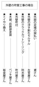 足場を全面組む外壁の吹替工事の場合、経年数や気候条件にもよりますが、六業者が力を合わせてやっと出来るのです。