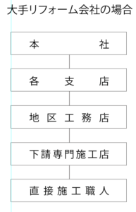 大手リフォーム会社の場合、工事は工務店に一括で丸投げで、下請けさせます。