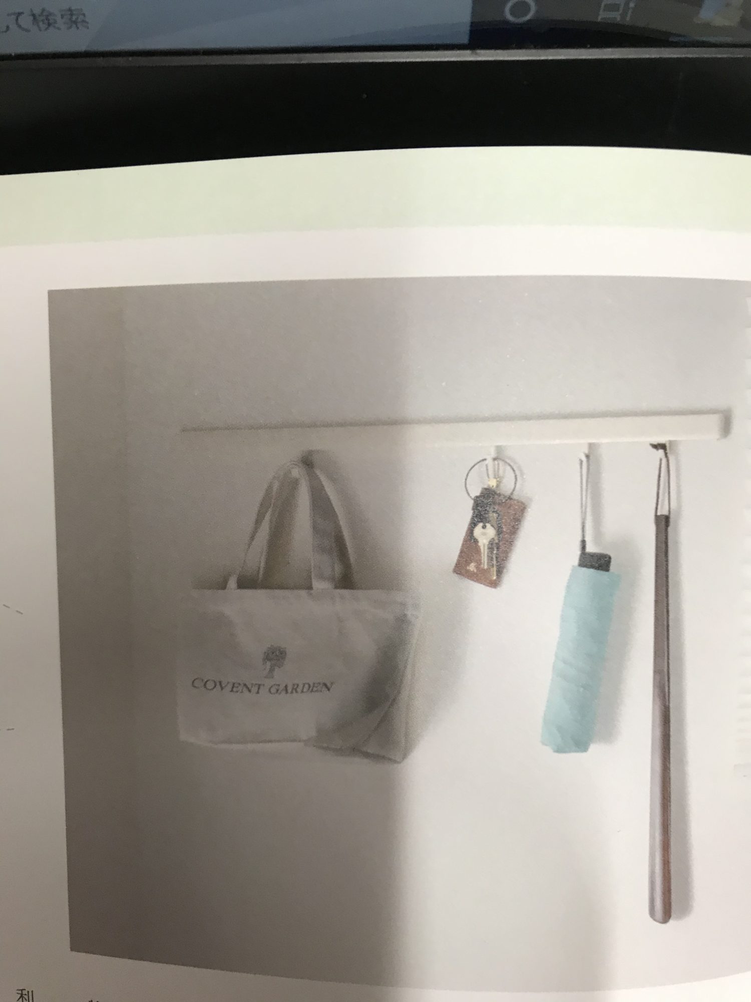 ピクチャーレールのワイヤーは左右に移動できます。 レールに直接フックをつけて鍵や折りたたみ傘。 小物トレイをつければ、トレイに小物も置けます。