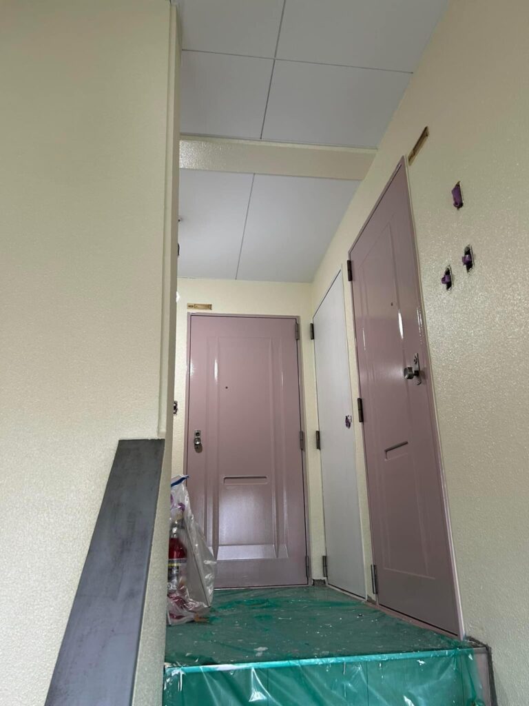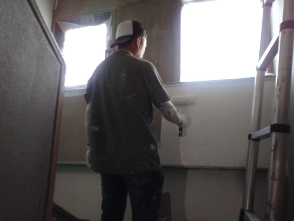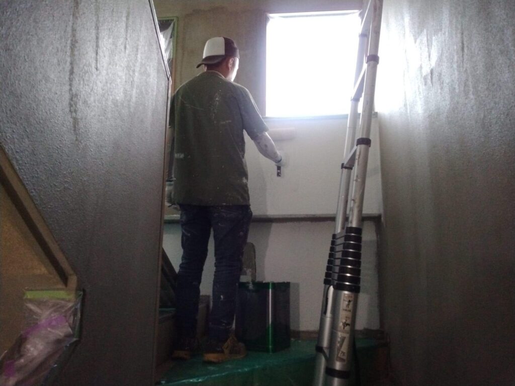 階段室、ホールの塗装・内装工事をやっています。実際の施工日は5月9日から5月27日の期間で行いましたが