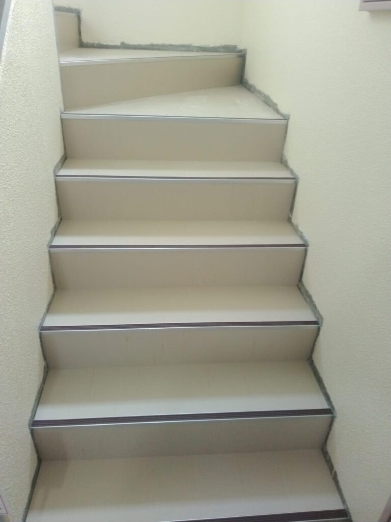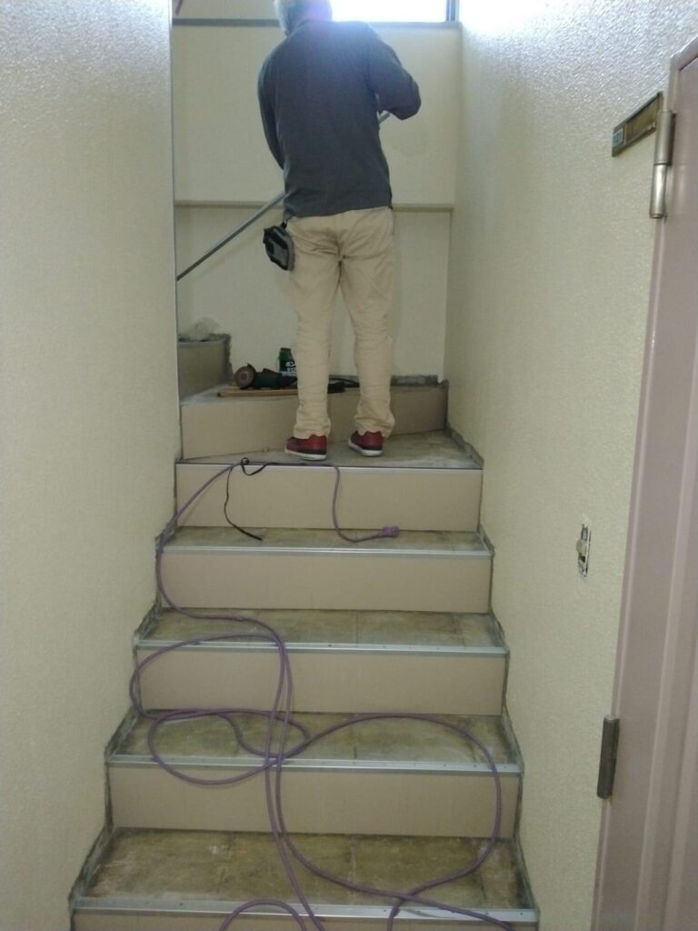 階段の踏み込みと蹴上げのビニールタイル施工しました。 最後にノンスリップを取り付けます。
