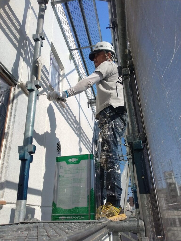 外壁の塗装工事です。 最近は吹き付けをするのは、ご近所への飛散防止のために ローラーの塗装工事が主力になりました。