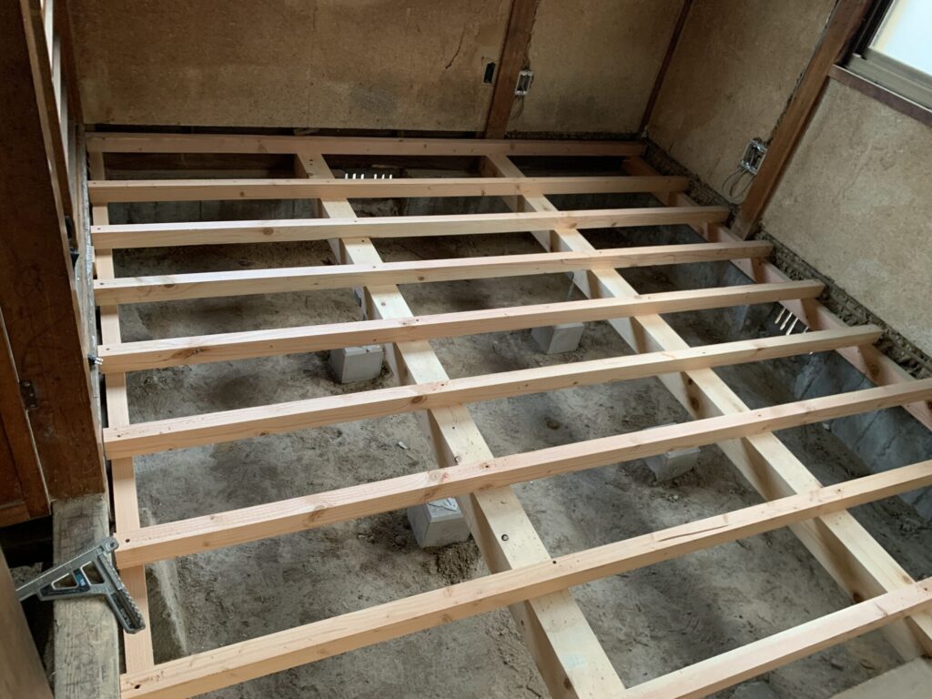 N様貸屋改修工事は、床に断熱材を入れ12mmの構造用合板を捨て張りしました。
