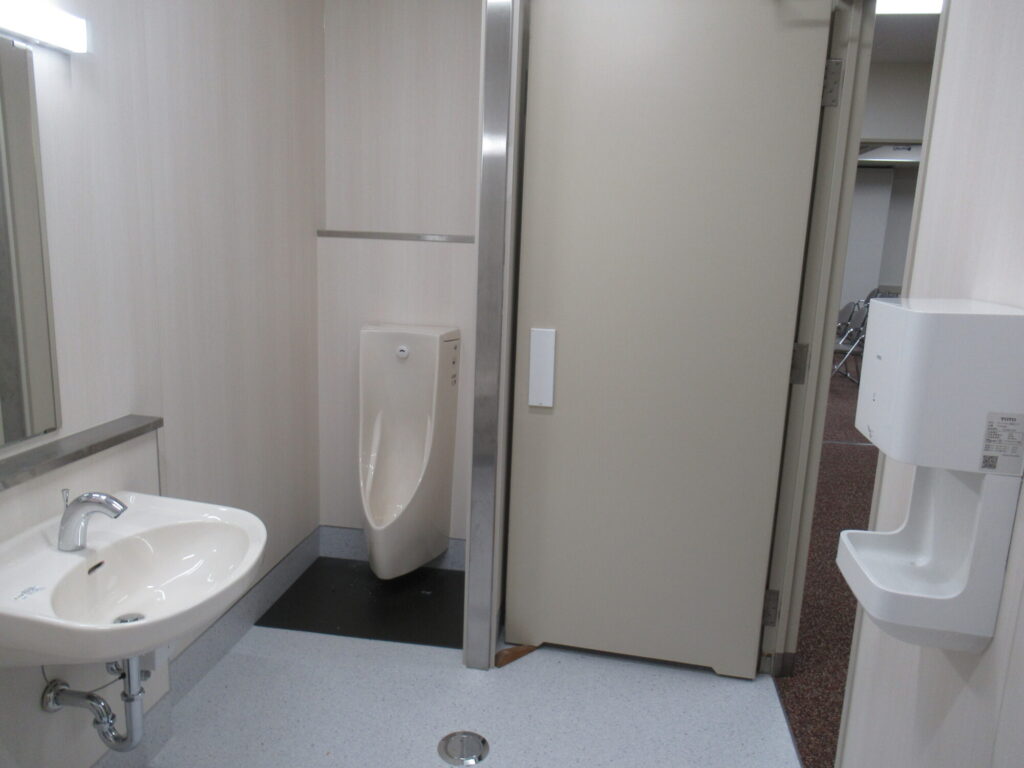 トイレでは既存のブースや便器などを外し、壁にケイカルバンを捨て張りしメラミン化粧板を貼りました。