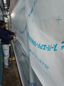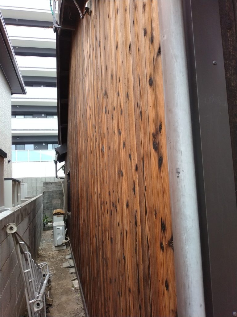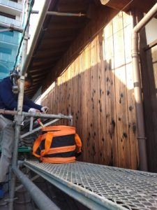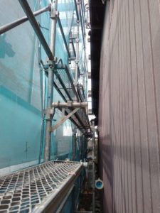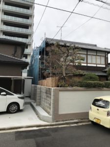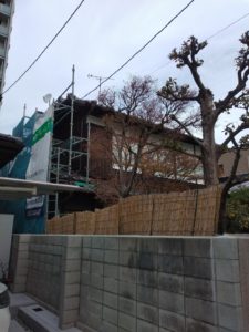 2022/03/28本日より、翠町で妻壁を焼杉で張り替える工事の足場組に入りました。