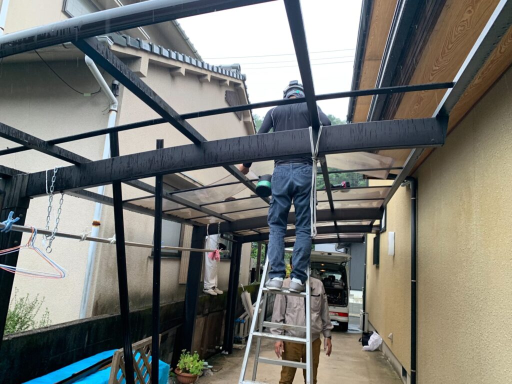 まず始めに、足場を組むためカーポートの屋根を取り外しました。
